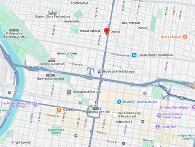 From Lancaster: Take Rt 30 East, then 202 North towards King of Prussia. Take 76 East into Philadelphia, taking I-676 East towards Central Phila. Take the Broad Street exit, then take a left heading North on Broad Street. Osteria will be on your left.